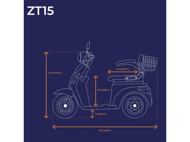 Το Veleco ZT15 Red είναι ένα τρίτροχο mobility scooter Class 3 με standard πνευματικά tubeless ελαστικά, σχεδιασμένο για χρήστες που θέλουν άνετη καθημερινή μετακίνηση, σταθερή συμπεριφορά στον δρόμο και πιο ομαλή κύλιση σε σχέση με αντίστοιχες λύσεις με συμπαγή ελαστικά.
