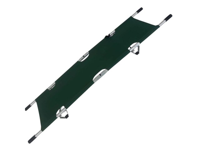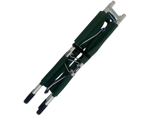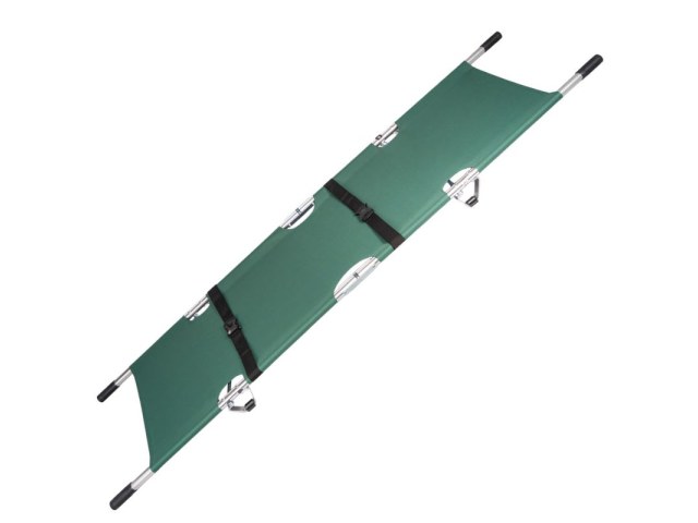 Φορείο αναδιπλούμενο κατά μήκος και πλάτος, σε πράσινο χρώμα, σχεδιασμένο για οριζόντια μεταφορά σε περιστατικά πρώτων βοηθειών, με έμφαση στη συμπαγή αποθήκευση και την εύκολη μεταφορά.