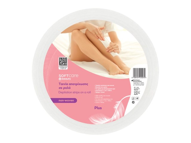Soft Care Plus non-woven waxing strip roll, size 7 cm x 100 m, designed for professional waxing services using strip-removal wax in beauty & spa settings.
