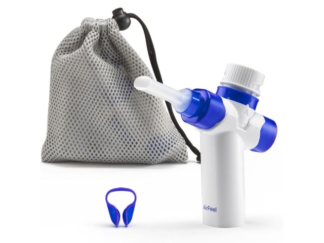 Box contents: AirFeel device, mouthpiece cap, mouthpiece, valve cap, valve, PEP module, ring nut, ball, PEP knob, handle, nose clip, travel bag.