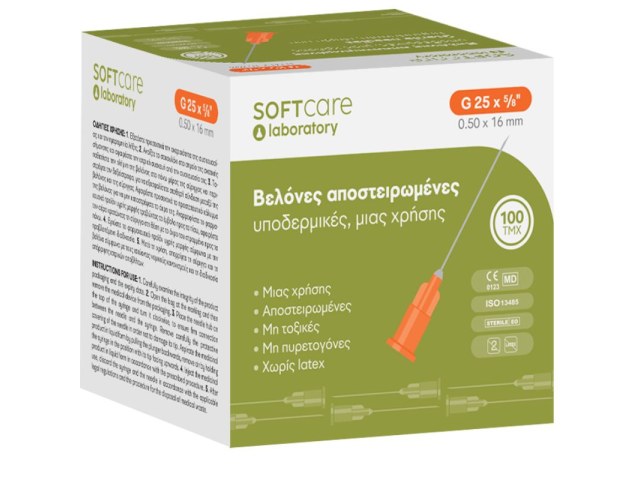 Soft Care needles G25 x 5/8" (0.50 x 16 mm) single-use, sterile, latex-free and pyrogen-free, compatible with Luer slip syringes, supplied in boxes of 100.