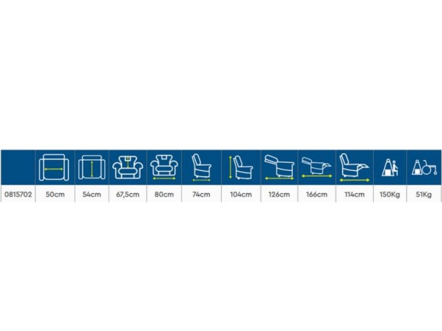 - Movements: Lift, recline with footrest raise, backrest raise, backrest recline