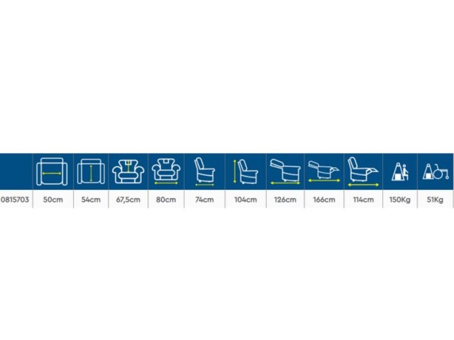 - Dimensions (as provided): Seat width 50 cm, seat depth 54 cm, seat height 67.5 cm, width 80 cm, depth 74 cm, height 104 cm, reclined length 166 cm, max height 126 cm, base length 114 cm