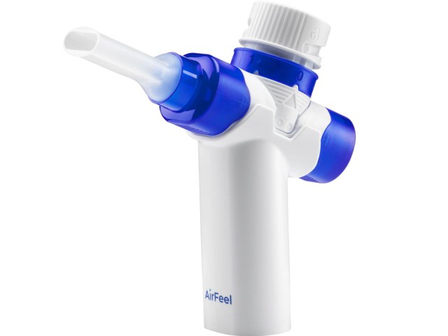 The AirFeel by FLAEM is a respiratory exercise device for exhalation training with PEP and OPEP modes, offering adjustable resistance and a portable design suitable for home or professional use.
